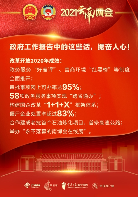 着眼推动高质量发展,完善高质量发展绩效评价办法和指标体系。政务服务“好差评”、营商环境“红黑榜”等制度全面推开,审批事项网上可办率达95%,58项政务服务事项实现“跨省通办”。加快要素市场化配置改革,运用价格杠杆促进弃水电量消纳。构建国企改革“1+1+X”框架体系,僵尸企业处置率超过83%,省属国企负债规模和资产负债率双控初见成效。地方政府隐性债务风险进一步得到化解、债务风险总体可控。P2P网贷风险整治成果明显。无分歧欠款清偿工作提前完成。统筹推进自然资源资产产权制度改革。各类开发区优化提升。全面推开农村集体产权制度改革整省试点。启动全国乡村治理体系首批试点县建设。全力抓好习近平总书记访缅成果涉及云南事项的贯彻落实。中国(云南)自由贸易试验区建设加快推进。合作建成老挝首个石油炼化项目、首条高速公路。举办“永不落幕的南博会在线展”。中国(昆明)、中国(德宏)跨境电子商务综合试验区加快建设。