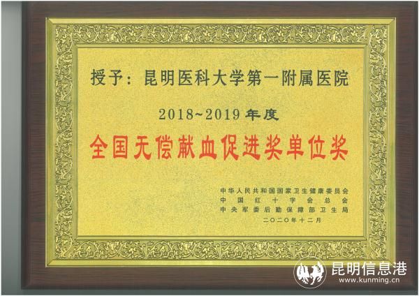 1月8日,国家卫生健康委员会、中国红十字会总会和中央军委后勤保障部卫生局联合发布《关于表彰2018-2019年度全国无偿献血表彰奖励获奖者的决定》,该院再获“全国无偿献血促进奖单位奖”荣誉,这是昆医大附一院连续第二届获此殊荣。