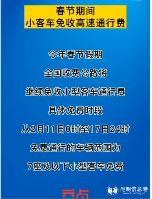 据悉,普通收费公路以车辆通过收费站收费车道的时间为准,高速公路以车辆驶离出口收费车道的时间为准。免费通行的车辆范围为7座及以下小型客车。