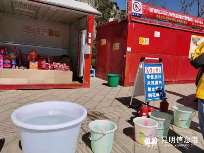 在官渡区古渡口路与付家营路交叉口的一个零售点上,记者看到,该摊点由两个安全仓组成,其中一个用来销售烟花爆竹,另一个则用来储存烟花爆竹。在安全仓内外的显眼位置,挂有“严禁烟火”、“禁止烟火”“零售点80米范围内禁止燃放烟花爆竹”等字样的提示标语。同时,还在醒目的位置张贴着烟花爆竹经营(零售)许可证、烟花爆竹零售安全承诺书、烟花爆竹安全购买燃放须知等。在这个销售点的安全仓外,摆放着大大小小的水桶,里面都装满水,可以随时灭火急用。此外,记者还注意到,今年所有零售点上,都禁止拉线接电,全部按要求使用充电炉。