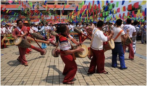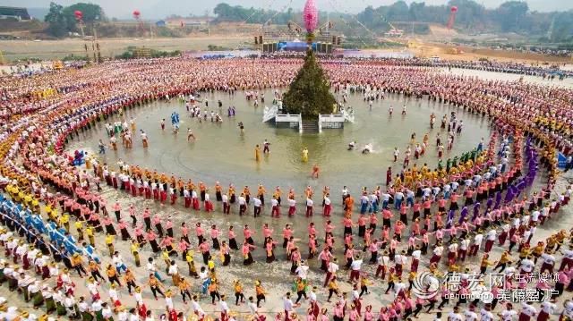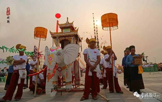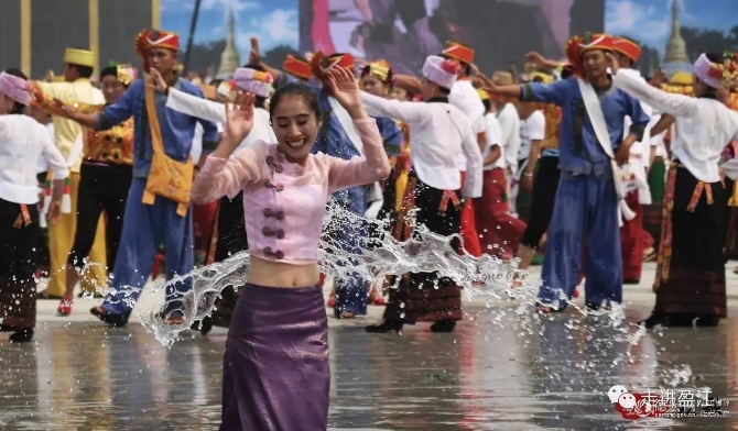 傣族泼水节是中国、柬埔寨、泰国、缅甸、老挝等地区傣族的新年,亦是阿昌族、德昂族、布朗族等民族共同的节日。泼水节源于印度,是古婆罗门教的一种仪式,后为佛教所吸收,约在公元十二世纪末至十三世纪初经缅甸随佛教传入中国云南傣族地区,逐渐融合、演化、传承下来的习俗,至今已有七百多年历史。泼水节一般在清明节后7天开始,即傣历六月中旬(公历4月13 日至15日)举行,为期 3~4天。第一天是傣族的“除夕”,第二天是“空日”,第三天是“元旦”。据相关文献《云南德宏傣族泼水节非物质文化遗产发展研究》可知,现代泼水节受到民族旅游和现代化的巨大影响。“在最传统的庆祝方式中,只是简单的泼水和舞蹈活动。到了20世纪60年代左右增加了赛龙舟、放高升、堆沙、丢包等活动。经过长期的演化及传承,现在泼水节的庆祝活动丰富多彩,已演化成一个全面体现傣族传统文化的综合舞台。现今的泼水节分成以村寨为单位的传统泼水节和政府组织的泼水节。”