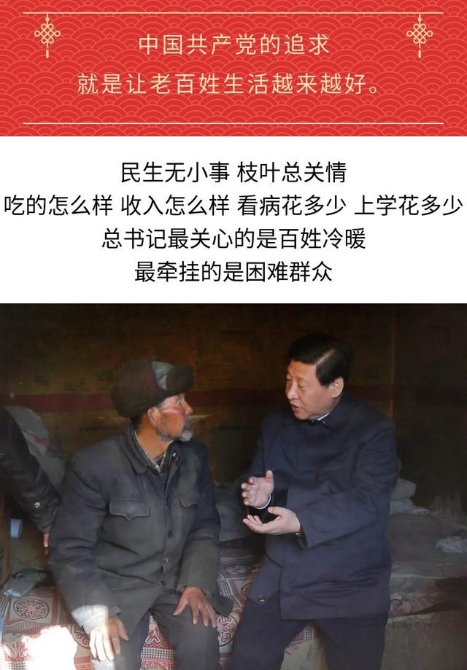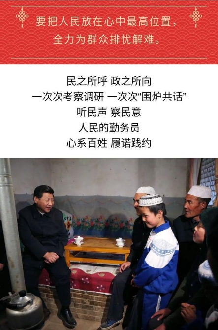 ↑2013年2月3日,习近平在甘肃临夏回族自治州东乡族自治县布楞沟村村民马麦志家,和一家人聊家常。