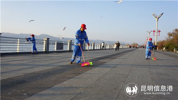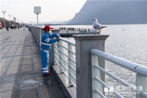 冬季的海埂大坝,除了远眺西山“睡美人”的静谧、欣赏漂浮在滇池上的点点白帆,观赏和喂食海鸥一定是昆明人乃至海内外游客不可或缺的“规定动作”。然而,每每喂食,衣服上常会不幸“中招”海鸥粪便,大家在感叹鸥粪难洗的同时,一定没有想过,那些掉落在大坝上的鸥粪是被怎样清理干净的。其实,这些像“口香糖”一样黏在地上的鸥粪极难清理,它们掉落在地面,被风吹后会变得干燥,并牢牢粘在地上,普通的扫帚根本无法扫净。传统的方法是用小铲子一点点铲,但那样费时费力,也不便于游客赏鸥。