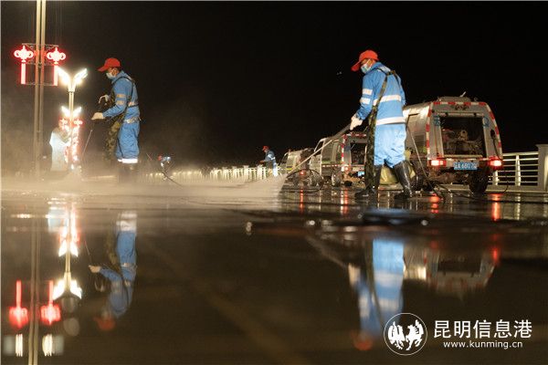 那么,如此顽固的鸥粪要如何处理呢?海埂大坝一尘不染的秘密,便藏在了每个人群散去的夜晚。每当夜幕降临,游客渐渐散去,云南京环海洁公司的环卫工人们登场了。5台步道车顺次排开,其中一辆首先将需要冲洗的路面进行湿化,浸润已经被风干的鸥粪,随即环卫工人们手拿高压水枪,对准鸥粪,各个击破,经软化的鸥粪在高压的作用下,不再顽固,渐渐融在了水中。“冲洗鸥粪难度不大,却是个技术活,如何用巧劲而不是蛮力,如何找到最佳喷水角度,让作业更高效,都是有讲究的。”云南京环海洁公司王志洪说道。