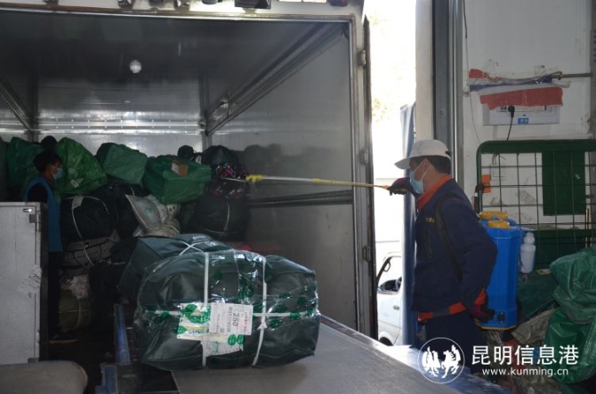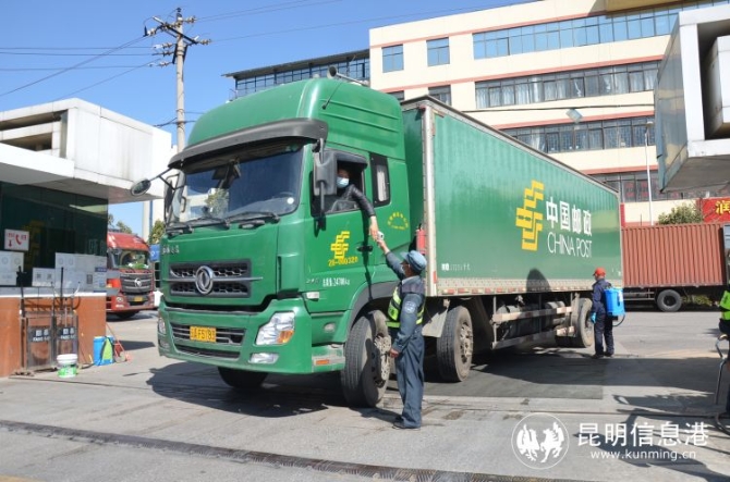 昆明邮区中心局工作人员正在对进局车辆进行消毒,对进局人员进行体温检测。