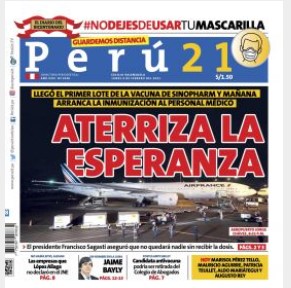 《秘鲁21》报8日也在头版头条以《希望落地》为标题,详尽报道中国疫苗抵达秘鲁,以及后续疫苗接种的相关信息。