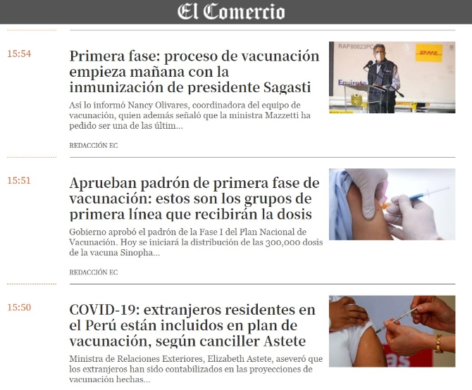 秘鲁《商报》在7日全程关注中国疫苗运抵过程,并在当天下午开启网络慢直播,实时直播负责运送疫苗航班的飞行路线路。8日,该报网站在动态新闻栏持续大量更新民众关心的疫苗相关信息。并第一时间播发信息,称卫生部8日宣布,第一阶段疫苗接种将从9日开始,秘鲁总统萨加斯蒂将成为第一个接种中国疫苗的秘鲁公民。秘鲁外交部也表示,随着后续疫苗数量的增加,在秘鲁居住的外国公民也有望接种疫苗。