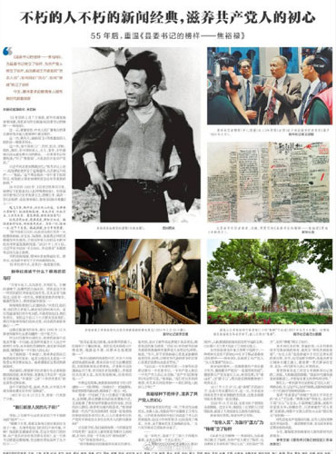 55年后,重温《县委书记的榜样——焦裕禄》,那激荡人心的不是文字,而是一个党员用行动书写的一切为了人民的生命历程。“党把这个县三十六万群众交给我们,我们不能领导他们战胜灾荒,应该感到羞耻和痛心。”“共产党员应该在群众最困难的时候,出现在群众的面前,在群众最需要的时候,去关心群众,帮助群众。”“活着我没有治好沙丘,死了也要看着你们把沙丘治好!”焦裕禄是这样说的,也是这样做的。有的人死了,他还活着。当你吟诵这篇报道,你就会知道,他没有死,他还活着。