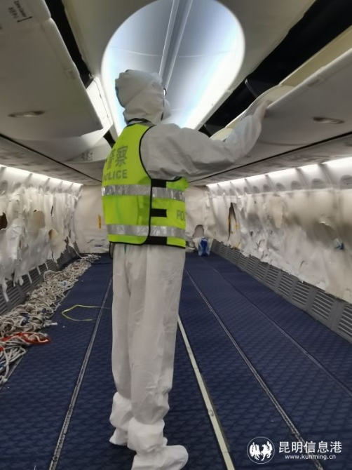 凌晨的停机坪空气湿冷,水汽凝结在了头戴的面屏上,形成了一条条小小的水流,民警们却丝毫不受影响,紧张有序地开展着清舱检查工作。