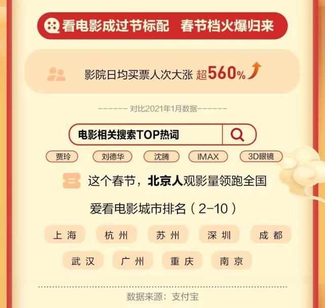 随着《唐人街探案3》、《你好,李焕英》、《刺杀小说家》等大片火爆,支付宝上日均买票观影人次上涨565%。奔着观影品质的大众越来越多,·贾玲、刘德华、沈腾“新铁三角”成为支付宝上搜索最热的电影人,与此同时,3D眼镜、 IMAX搜索涨幅也都超过650%。