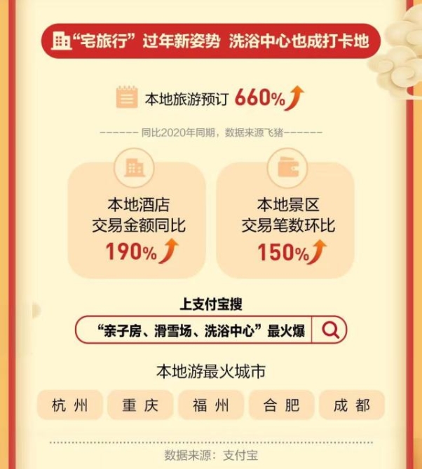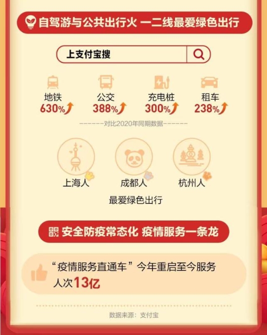 春节出门玩,更多人选择绿色出行。春节期间,支付宝上地铁、公交、充电桩的搜索量分别增长了624%、388%、296%。上海、成都、杭州、合肥、武汉、南京、广州、郑州、北京、天津等一二线城市也因为更多人选择就地过年,从而成为春节期间公共交通最繁忙的城市。