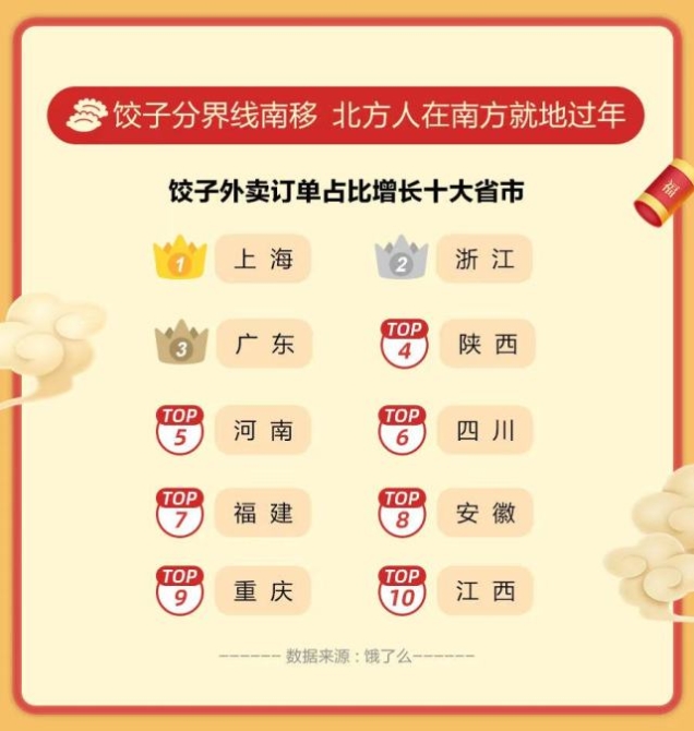 就地过年的影响也体现在外卖消费习惯上,从饿了么数据来看,南方饺子外卖消费数量也呈现增长,不少选择留在南方过年的北方人拉动了饺子外卖消费。从饺子份额增长前十省市来看,除了陕西、河南,其余八个都是南方省市,排名前三增长省市为上海、浙江和广东。