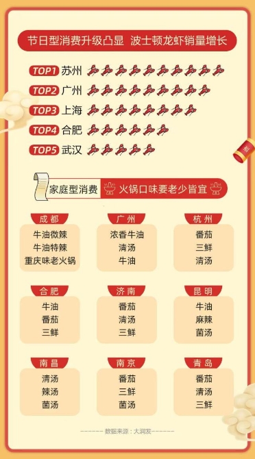 饿了么和大润发数据显示,在春节期间,花都昆明依然在鲜花的消费上远远领先全国,同比去年昆明鲜花销量增长109倍。大年三十到年初四期间,大润发春节5天卖出超过22万份火锅底料,昆明人的礼盒消费排全国第四,前三位分别是成都、合肥、济南。