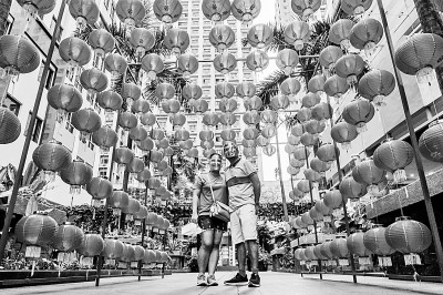 2月12日,一对情侣在菲律宾马尼拉与红灯笼合影。为庆祝中国春节,菲律宾一些地方被红灯笼、对联等中国特色的春节装饰所装点,为当地增添了中国年味儿。新华社发