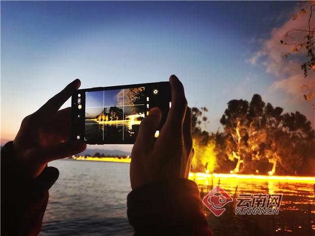 游客在昆明海洪湿地赏灯光夜景 王欢 摄