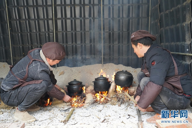 汪程辉(左)和朋友正在往火塘里添柴火(2020年12月30日摄)。新华网发(李丹/摄)