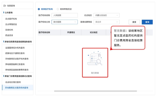 “开通情况”为“已开通”,说明该定点医药机构可以正常提供门诊费用跨省直接结算服务;“开通情况”为“内部测试”,说明该定点医药机构正在真实业务环境开展内部测试,暂时无法提供门诊费用跨省直接结算服务。查询情况为“暂无数据”时,说明该统筹地区暂无定点医药机构提供门诊费用跨省直接结算服务。