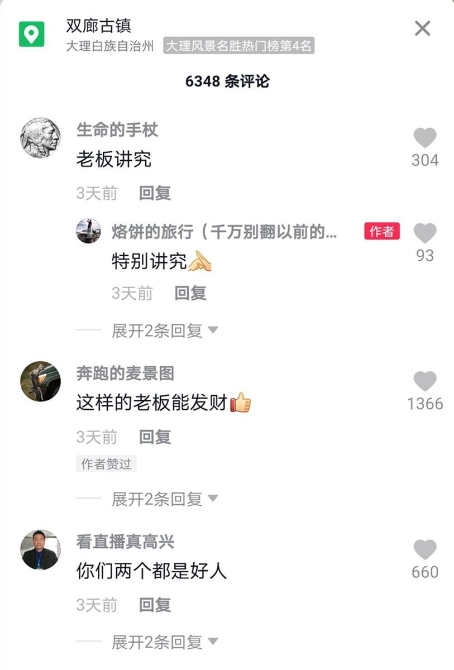 “这样的老板讲究!”“感觉到了人情温暖!”近日,北京游客陈先生在抖音视频分享了自己在大理双廊古镇“榕树下餐厅”就餐发生的一个小插曲,获得广大网友点赞,纷纷表示“好人遇上了好人”“将心比心,满满正能量”!