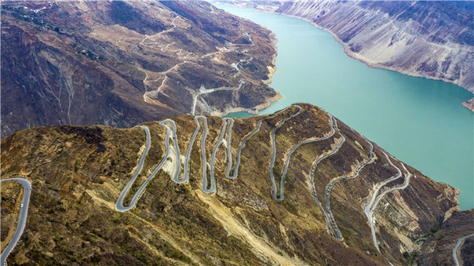 搬家车队在开道警车的引领下从云南省永善县大兴镇开往鲁甸县卯家湾易地扶贫安置区(2020年3月15日摄,无人机照片)。新华社记者江文耀摄