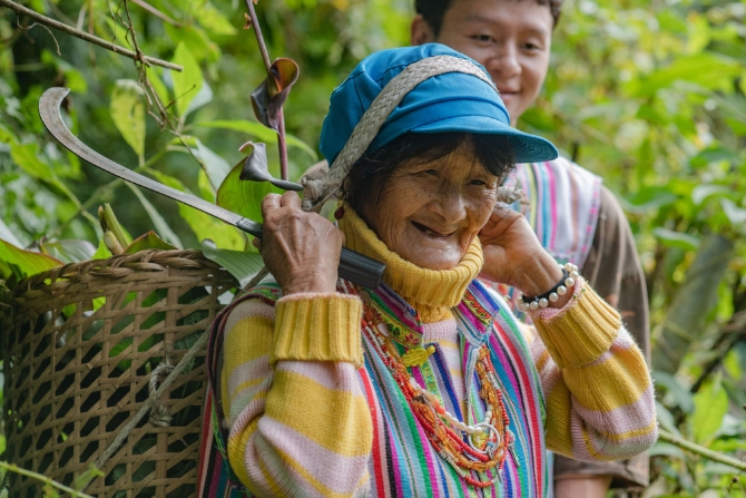 在云南省贡山独龙族怒族自治县独龙江乡孔当村,79岁的独龙族老人孔当娜割完猪草准备下山(2020年10月31日摄)。新华社记者胡超摄