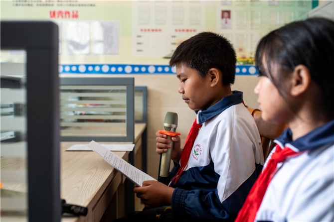 傈僳族学生杨天武(左)在云南省怒江傈僳族自治州泸水市大兴地镇格力小学校园广播站练习播音(2020年11月5日摄)。新华社记者胡超摄