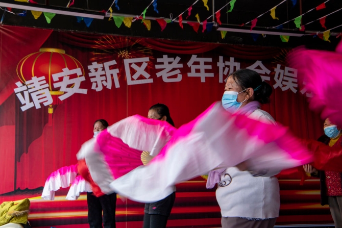 搬迁群众在靖安新区老年协会娱乐中心跳舞(2021年2月3日摄)。新华社记者江文耀摄