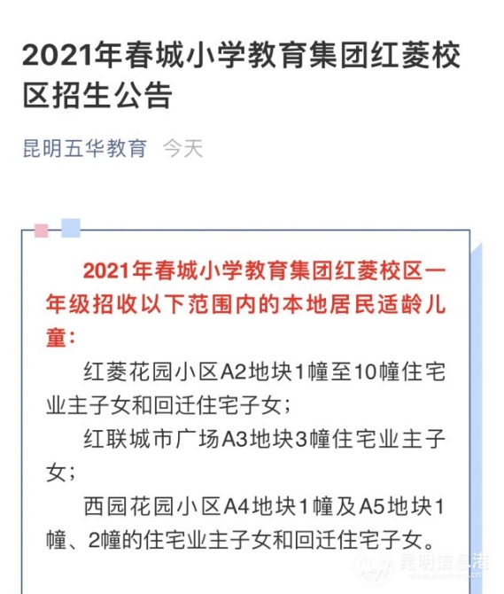2021年春城小学教育集团红菱校区一年级招收以下范围内的本地居民适龄儿童: