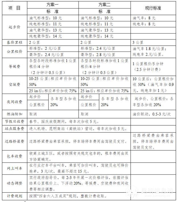 此外,两个《方案》中均提到拟取消燃油附加费。同时,增加节假日收费和站点服务费,确保市民在特殊时段、重点区域的用车需求。在“春节”“国庆”两节放假期间租用车辆的,拟每车次加收5元。进入机场、昆明南站(高铁站)指定候客区营运,拟每车次加收5元。