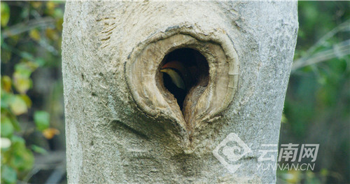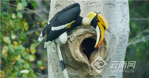 近日,自然生态摄影师尹以祜、曾祥乐、郑山河在云南省盈江县的“中国犀鸟谷”拍摄时,意外记录到了国家一级重点保护野生动物双角犀鸟雌鸟进树洞准备育雏时,用它的大嘴将“爱巢”洞口封闭缩小的影像。