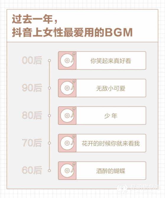 不同年龄的女性偏好也各有差异。比如从女性用户爱用的背景音乐看,00后、90后喜欢《你笑起来真好看》、《无敌小可爱》都是偏可爱类型的歌曲,80后喜欢以《少年》回忆往昔。而70后最爱的《花开的时候你就来看我》和60后喜欢的《酒醉的蝴蝶》无论从旋律还是歌词,都有较浓的时代特征。
