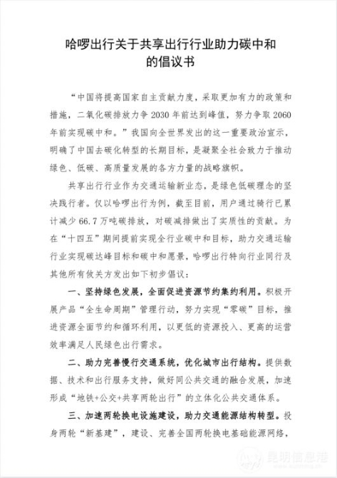 在今年全国两会上,碳达峰、碳中和被首次写入政府工作报告,令这一中国对世界的庄严承诺再次成为热点话题。3月10日,专业移动出行平台哈啰出行发布共享出行行业内的首份碳中和倡议书,呼吁共享出行行业、产业链合作伙伴及相关领域专家学者共商行业碳达峰、碳中和行动路线图,为实现中国“双碳”目标贡献行业力量。