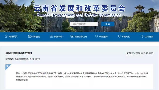 6686体育讯 3月17日,记者从云南省发展和改革委员会官网了解到,云南省发展和改革委员会对市民留言询问昆明地铁嵩明线动工时间的问题进行了回复,昆明地铁嵩明线项目由于未列入国家批准的相关规划,暂不具备开工建设条件。