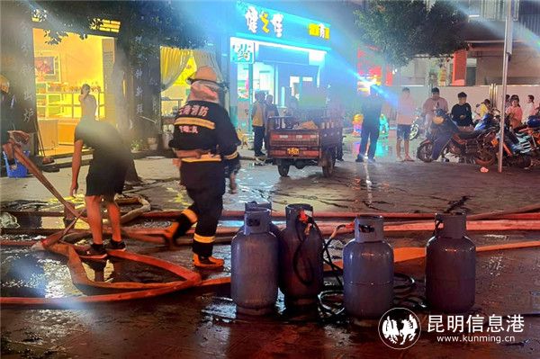 20时54分,消防队伍抵达现场。火场内滚滚浓烟、熊熊烈焰,还放置有四个液化气罐,若受到长时间的高温炙烤,极有可能发生罐体爆炸,造成人员伤亡。加之事故地点周边有大量居民住宅,现场聚集了众多围观群众,情况十分危急。