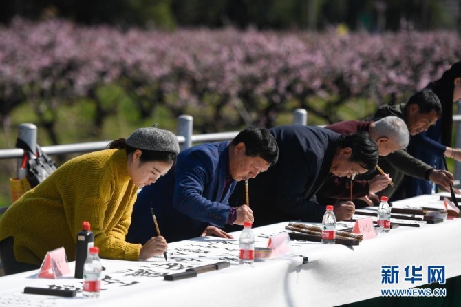 3月22日,参加“清廉笔会”主题活动的书法爱好者在奉化区萧王庙街道林家桃园内创作。记者黄宗治/摄