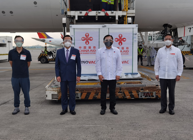 中国驻菲律宾大使黄溪连同菲律宾参议员克里斯托弗·吴、菲律宾卫生部长杜凯、菲律宾国家抗疫工作组副总协调人迪松等赴机场迎接并出席疫苗移交仪式。