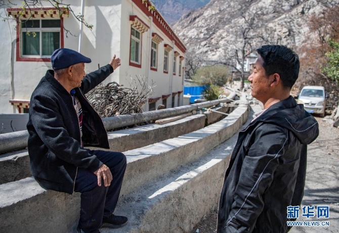 被害农奴之一向秋的儿子、今年78岁的邓都(左)向村里的年轻人介绍水渠的情况(3月19日摄)。新华社记者 孙非 摄