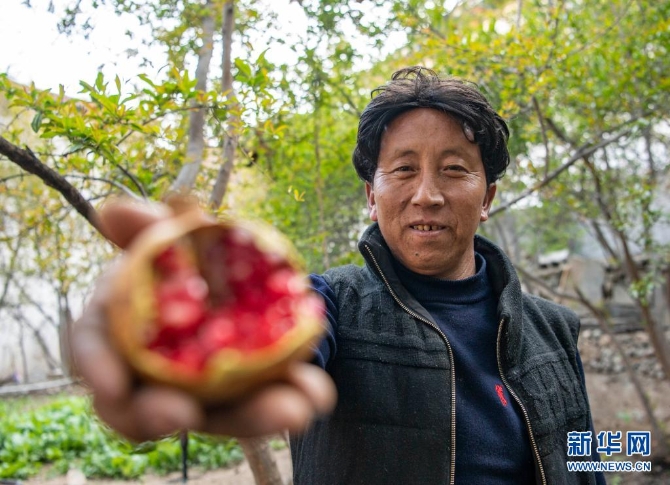桑登在展示自己种出来的石榴(3月18日摄)。新华社记者 陈尚才 摄