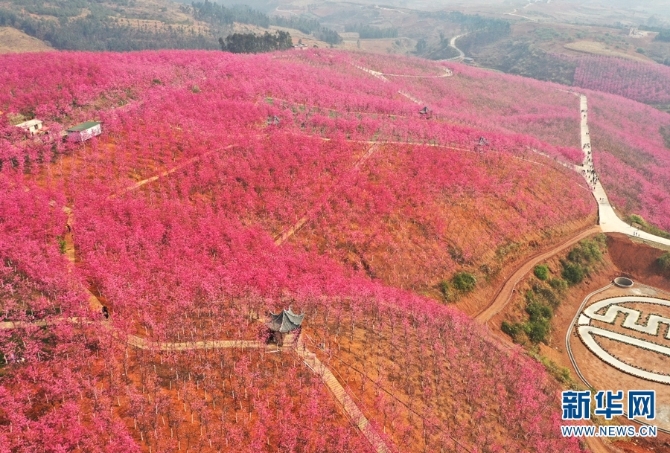 图为航拍视角下的宜良县山后社区樱花谷。 (新华网发 崔永江/摄)