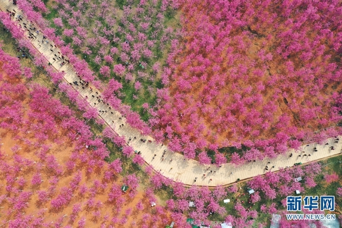 三月春风来,正是赏花时。云南省昆明市宜良县山后社区,占地3800亩的樱花谷花开正艳,树树繁花绵延成一片浪漫的粉色花海,如云似霞,美不胜收,吸引了众多游客的到来。据悉,宜良县山后社区樱花谷种植有云南樱花、山樱花、冬樱花、垂枝樱花等多个品种,每年12月底至次年4月下旬依次盛开,前后花期长达4个月。