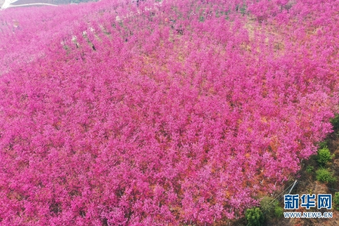 航拍视角下的宜良县山后社区樱花谷。 新华网发(崔永江/摄)