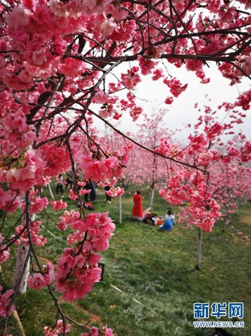 游客在宜良县山后社区樱花谷中赏花。 新华网发(崔永江/摄)