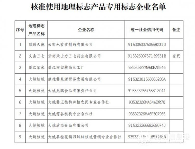 自3月31日起核准云南永孜堂制药有限公司、云南天士力三七药业有限公司、墨江回归粮油加工厂、楚雄彝星源贸易发展有限公司、大姚兆鹏食品有限责任公司、大姚彝王核桃种植农民专业合作社、大姚源谷核桃专业合作社、大姚欣杰食品有限公司、大姚县桂花镇四姊妹核桃营销专业合作社在内的9家企业在其生产的地理标志产品上使用地理标志产品专用标志,获得地理标志产品保护。