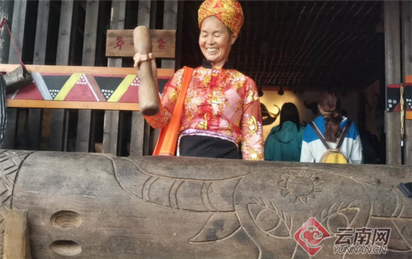 少数民族游客敲击司莫拉木鼓 记者秦黛玥/摄