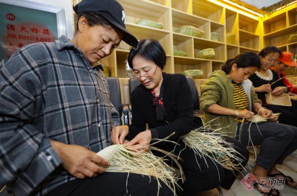 福贡县匹河怒族乡托坪村扶贫车间里,搬迁群众正在接受草果编织培训,在这里草果杆被做成草帽、手包、拖鞋…… 谢宇/摄
