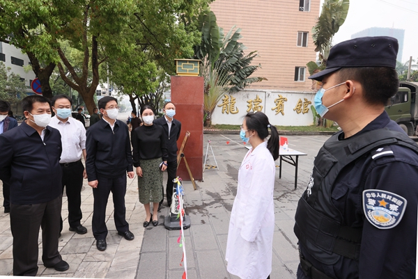 上午,王予波、雷海潮率队到龙瑞高速瑞丽东卡点督导检查,看望慰问值勤值守人员,要求严格落实管控措施,严控车辆、人员出入,严防疫情扩散;到集中隔离观察点检查隔离措施落实、生活保障、防疫消杀等情况,对一线工作人员的辛勤付出表示感谢,要求认真落实点长责任制,强化人员培训,严格防控措施,加强健康监测和医学观察,坚决阻断疫情传播链。