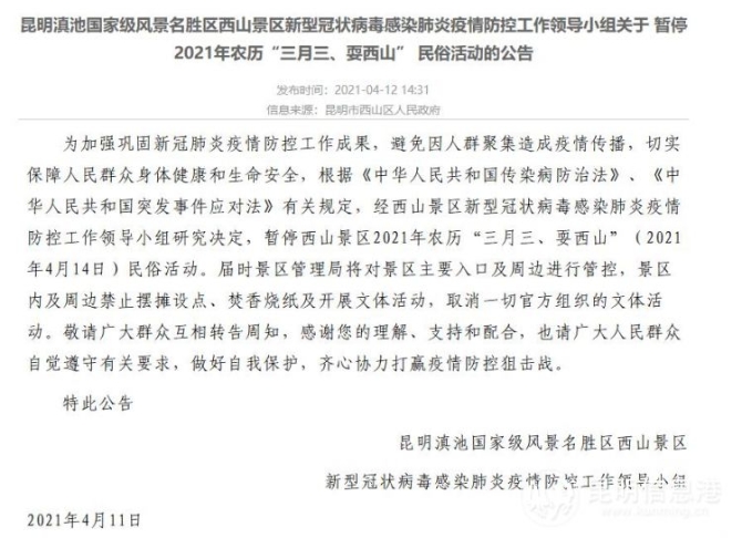 公告指出,暂停活动是为了加强巩固新冠肺炎疫情防控工作成果,避免因人群聚集造成疫情传播,切实保障人民群众身体健康和生命安全,根据《中华人民共和国传染病防治法》、《中华人民共和国突发事件应对法》有关规定,经西山景区新型冠状病毒感染肺炎疫情防控工作领导小组研究决定,暂停“三月三、耍西山”民俗活动。