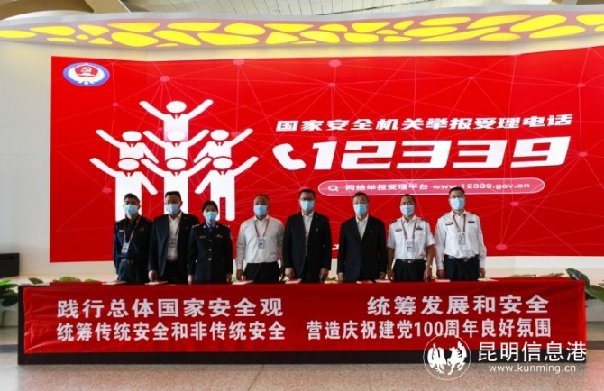 上午9时30分,“全民国家安全教育日”活动启动仪式在航站楼出发层举行。昆明机场在航站楼安检口、登机口、行李提取大厅和办公区等区域的电子显示屏播放了宣传资料。机场各成员单位的代表身披“文明志愿者”绶带,现场向过往的乘机旅客发放了《中华人民共和国宪法》《中华人民共和国反间谍法》《中华人民共和国国家情报法》《中华人民共和国国家安全法》等宣传资料2000多份。