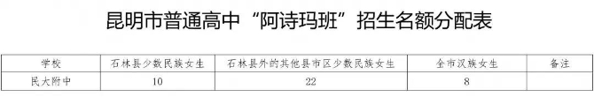 在云南民大附中开办“阿诗玛班”(限招女生),招生40名,少数民族女生占80%,汉族女生占20%。其中面向石林县招收少数民族女生10人;面向石林县外的其他县市区招收少数民族女生22人;面向全市招收汉族女生8人。