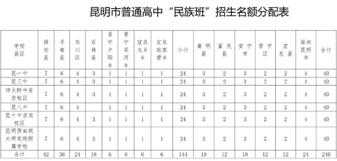 在昆一中、昆三中、昆八中、昆十中求实校区、云南师大附中呈贡校区、昆明西南联大研究院附属学校6所学校开办“民族班”(男女生均招),计划招生240名,每校40名。