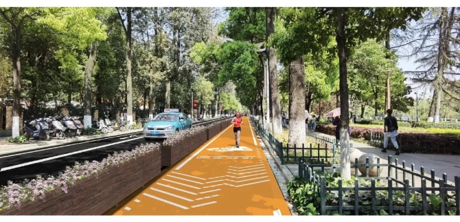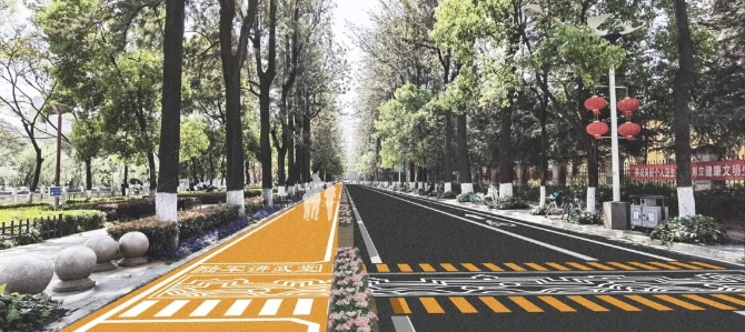 翠湖慢行跑道设计内容主要以橙黄色为跑道颜色,底部涂层采用水性环氧改性树脂,罩面采用是水性聚氨酯涂料,具有耐久性好、厚度小、环保等优势;其次,采用自发光涂料喷涂标识标线,并将里程数、记事年份等纳入标识内容同步施划;采用木质隔离花箱与机动车道分隔,并用感应灯和灯带进行照明装饰。为确保工程的知晓率和民主性,前期区城市管理局已发放《关于翠湖环路非机动车道改为逆时针单向通行的民意问卷调查表》征求市民建议,同时为确保交通安全、有序,将非机动车道改为逆时针单向行驶,并发布《实行翠湖环路非机动车单向通行管理的公告》。